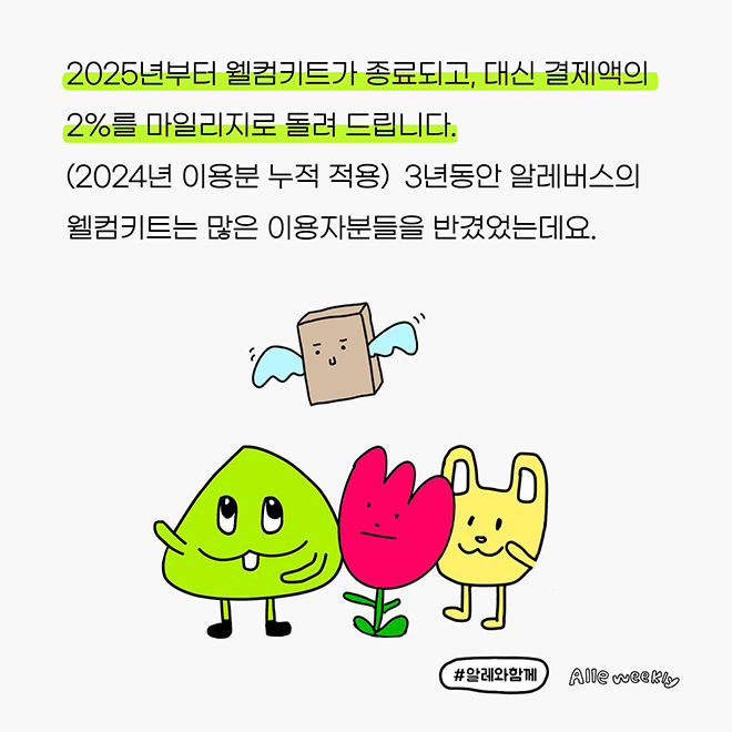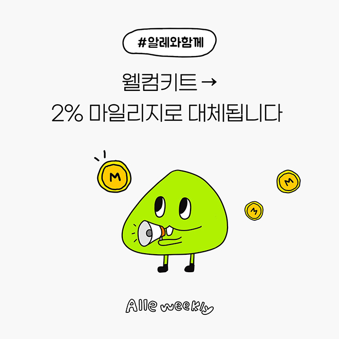알레버스 웰컴키트가 종료됩니다. 대신 이용자 여러분들에게 결제 금액의 2%에 해당하는 마일리지를 적립해 드릴거예요.