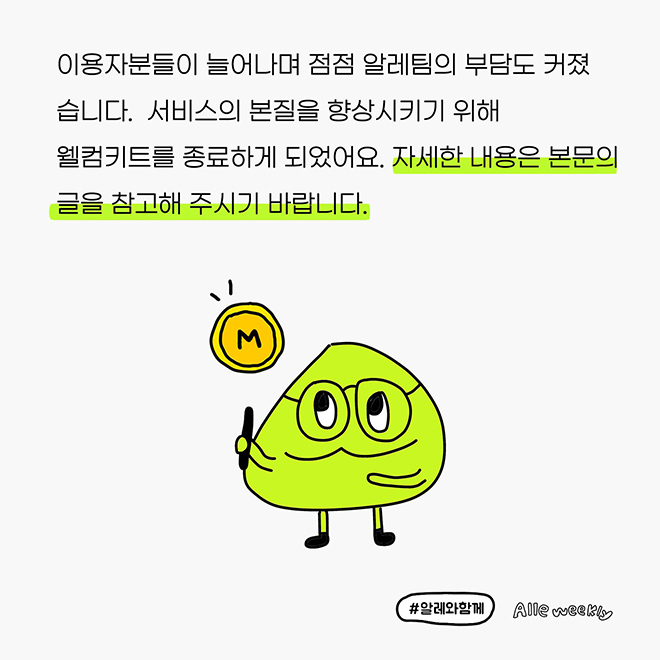알레 팀은 알레버스를 이용하시는 분들에게 진심 어린 고마움을 느끼고 있어요. 웰컴키트를 처음 시작했던 그 순수한 감정을 아직도 짙게 가지고 있습니다. 여러분을 반기던 웰컴키트는 사라지지만 더 편리하고 유용한 서비스가 되기 위해 노력 하겠습니다. 지켜봐 주세요!