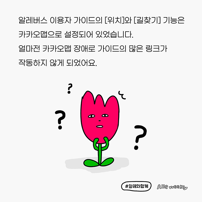 알레버스 이용자 가이드에는 그동안 카카오맵의 링크와 길찾기 기능을 사용해 왔습니다. 얼마전 카카오맵에 일어났던 장애로 인해 몇몇 링크들이 제대로 작동을 하지 않게 되었어요.