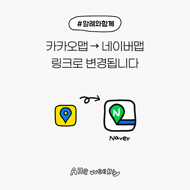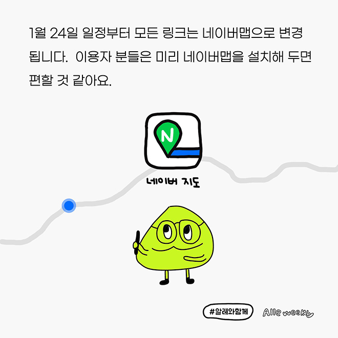 1월 24일 일정부터 알레버스의 이용자가이드에 적용되는 링크는 모두 네이버맵으로 대체될 예정이에요.