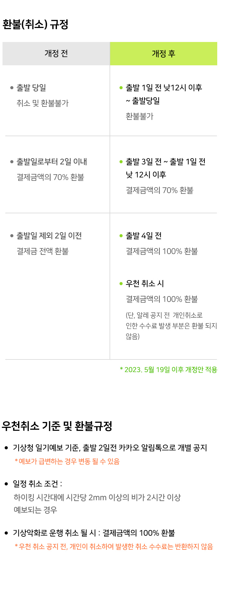 안녕하세요. 알레~ 입니다. 2023년 5월 19일(금)부터 적용되는 변경될 환불(취소)규정에 대해 아래와 같이 안내 드립니다. 5월 19일 이후에는 변경된 환불 규정이 적용되오니 이용에 착오 없으시길 바랍니다. 감사합니다.