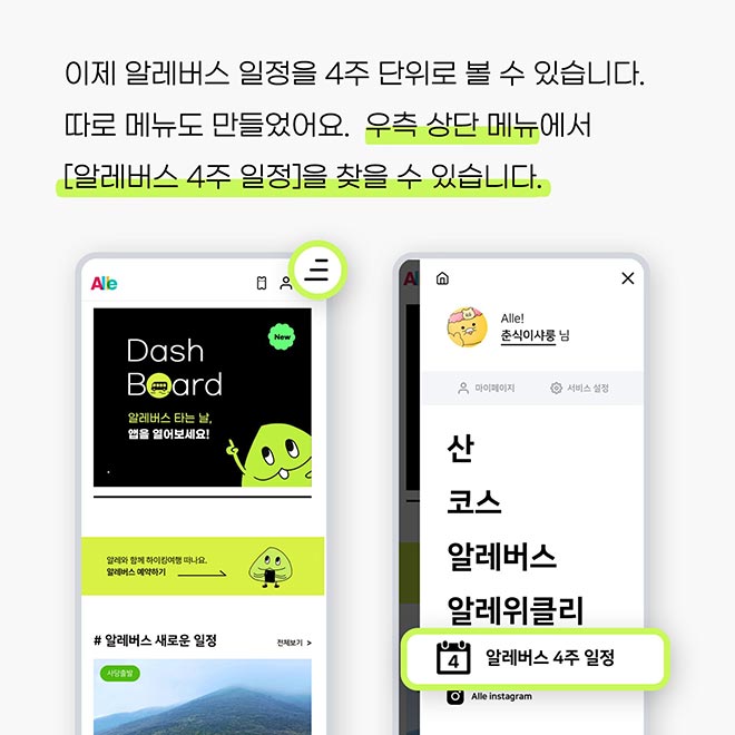 알레 앱 우측 상단의 메뉴에 들어가면 [알레버스 4주 일정]을 발견할 수 있을거예요.